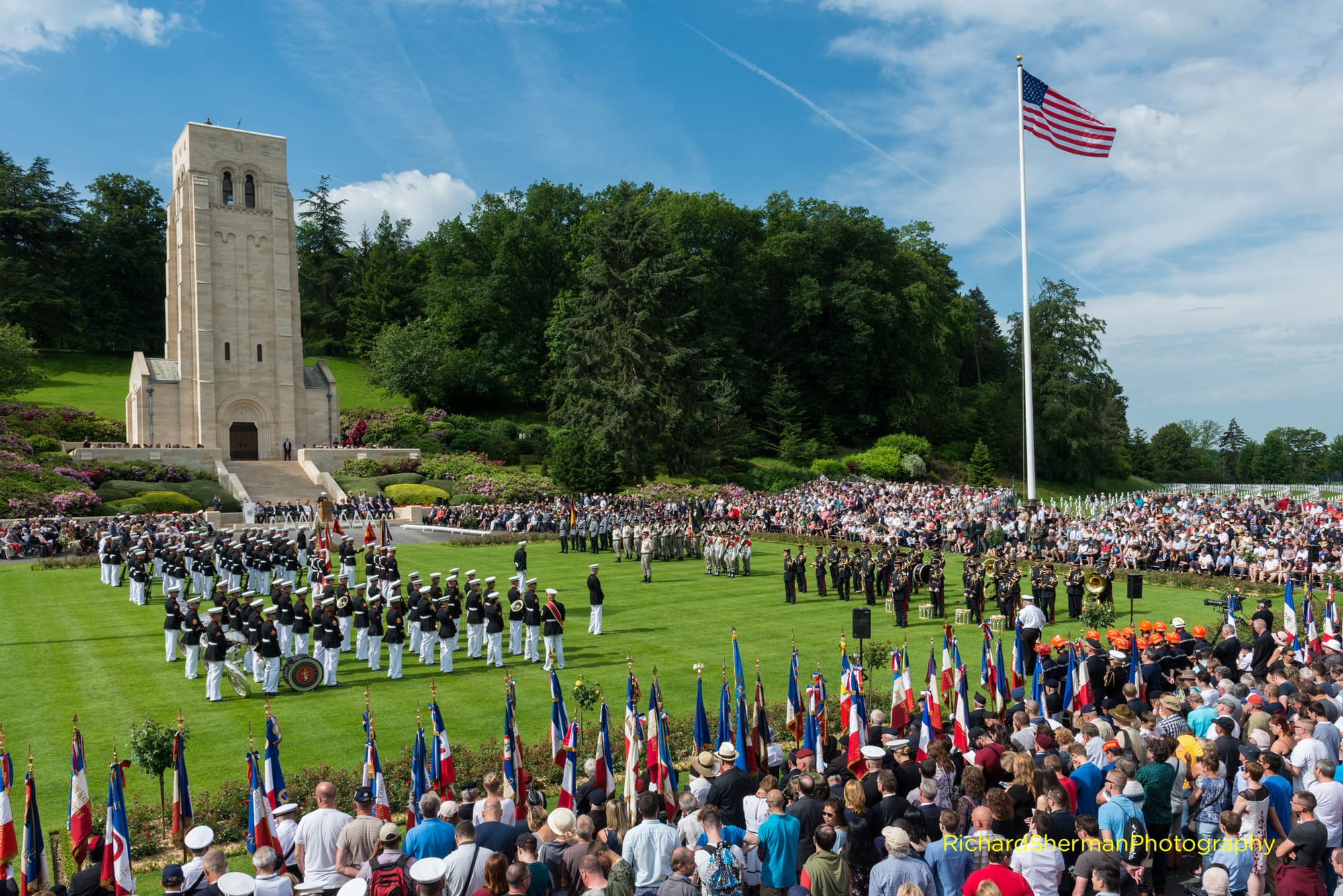 75th Commemoration of D-Day Landings Normandy American Cemetery June 6, 2019The famed Normandy American Cemetery is located 175 miles west of Paris and spans 172.5 acres. Among the 1,557 names on the Tablets of the Missing and 9,387headstones are 45 sets of brothers and three Medal of Honor recipients. The cemetery rests above Omaha Beach where 34,000 Allied troops came ashore on D-Day in the bloody battles that began the liberation of France.It was dedicated in July, 1956.