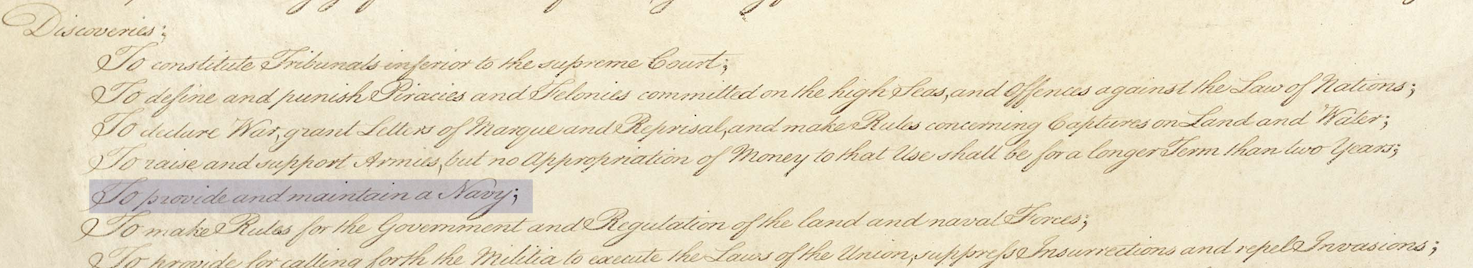 Meanwhile, the shipping industry, which patriotic propagandists had promised would flourish after the removal of British taxes and trade restrictions, now had to face the hard reality of no longer being part of the British trading system. Export access to Britain’s hungry West Indies slave colonies devoted to the production of sugar and coffee had accounted for more than two thirds of American agricultural exports. No longer part of the British empire, these ports were closed to American-flagged ships after the Peace of Paris. British merchants by law could no longer have their ships built in American shipyards, which collapsed the American shipbuilding industry. With Europe at peace and traditional export markets closed, American trade volumes fell by half and New England in particular fell into a deep post-war economic depression. It was this depression which caused debt-ridden farmers in western Massachusetts, led by Revolutionary War veteran Daniel Shay, to rise up in what is today called “Shay’s Rebellion” and helped propel the replacement of the weak Article of Confederation with the Constitution that we all use, with the addition of 27 Amendments, today. Among the powers the Constitution grants Congress is the ability to “provide and maintain a navy.”