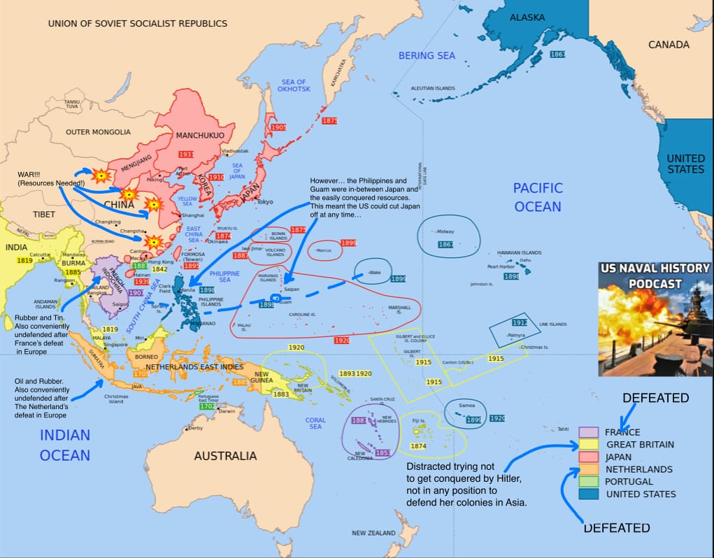 In the years leading up to WWII, Hitler was not the only one looking east for land and resources. From halfway around the world, the Japanese fixed an uneasy and calculating eye across the broad Pacific towards the United States. The driving economic issue was that the island of Japan lacked most of the raw materials essential to sustain a modern industrial economy, including iron, copper, tin, zinc, rubber and, most importantly, oil. These could, of course, be purchased from overseas, but the problem was that this course created a dependency that was intolerable to the Japanese government, especially after we Americans began to impose sanctions and conditions on further sales. At the time the United States was the world’s biggest oil producer and American oil sanctions meant that Japan had a choice, find another source of oil or bow to American demands they withdraw from their war in China. By the 1930s, many Japanese had come to believe that they must choose between accepting Western interference as a price of continued economic growth and foreign policy independence, or forcefully establish economic independence by taking those commodities for themselves.