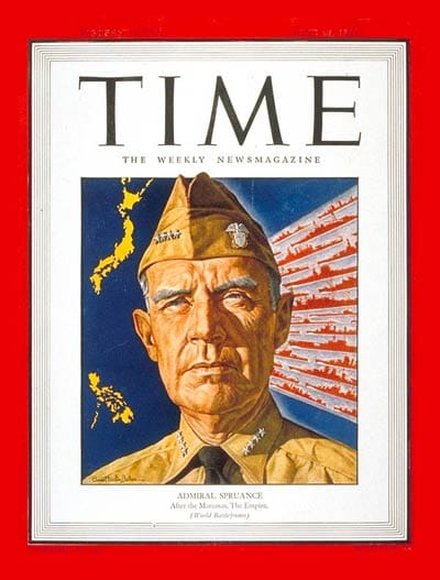 With the addition of the massive new Essex-class carriers rolling out of the dockyards every month, the Navy now had a veritable abundance of portable air power, and down the center we went. Twelve battleships, nine fleet carriers, eleven smaller carriers, twelve cruisers, and enough amphibious ships to crush island after island descended on the Japanese under the command of Admiral Raymond Spruance, the namesake of my first ship in the navy, good ‘ol DDG-111.